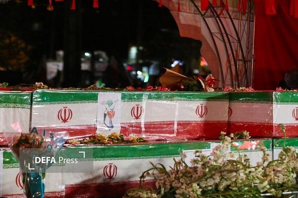 حاضران، تصاویر شهدا و پرچمهای ایران را در دست داشتند و بسیاری از مادران و پدران شهدا، در حالیکه اشک از چشمانشان جاری بود، با تابوتهای سبز و سفید و قرمز وداع میکردند و بر روی تابوتها گل و پرچم میگذاشتند.