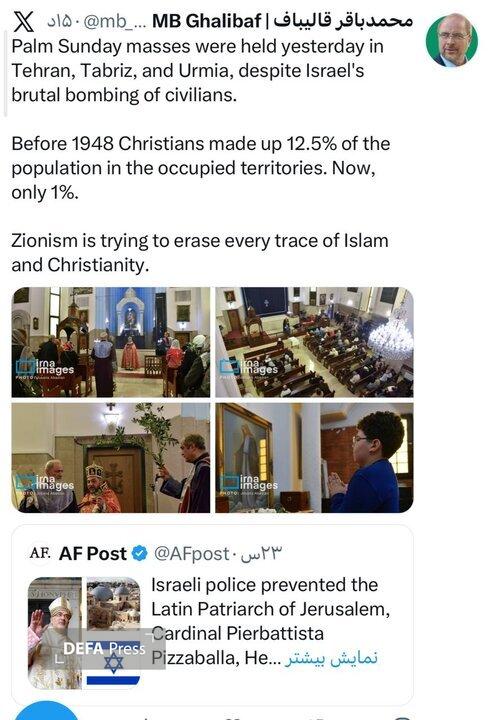 به گزارش گروه سیاسی دفاع پرس، محمدباقر قالیباف رئیس مجلس شور ای اسلامی در مطلبی در صفحه شخصی خود در شبکه اجتماعی ایکس در واکنش به جلوگیری رژیم صهیونیستی از برگزاری مراسم یکشنبه نخل در بیت المقدس نوشت: