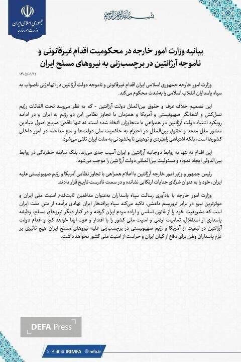 بیانیه وزارت امور خارجه در محکومیت اقدام غیرقانونی و ناموجه آرژانتین در برچسبزنی به نیروهای مسلح ایران