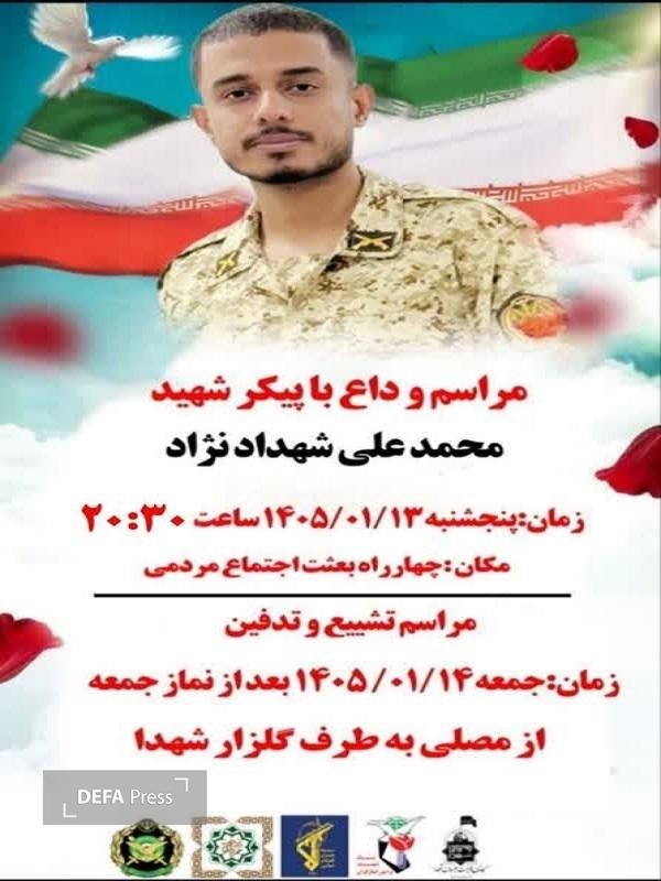 مراسم وداع با پیکر مطهر شهید «محمدعلی شهدادنژاد» روز پنج‌شنبه ساعت ۲۰:۳۰ در چهارراه بعثت شهرستان جیرفت برگزار خواهد شد.