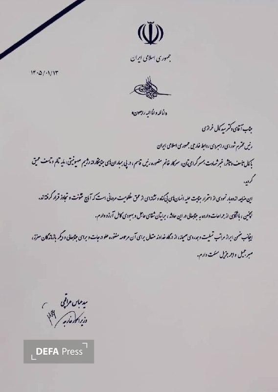 به گزارش گروه بینالملل دفاعپرس، «سیدعباس عراقچی» وزیر امور خارجه در پی شهادت همسر «کمال خرازی» پیامی منتشر کرد.