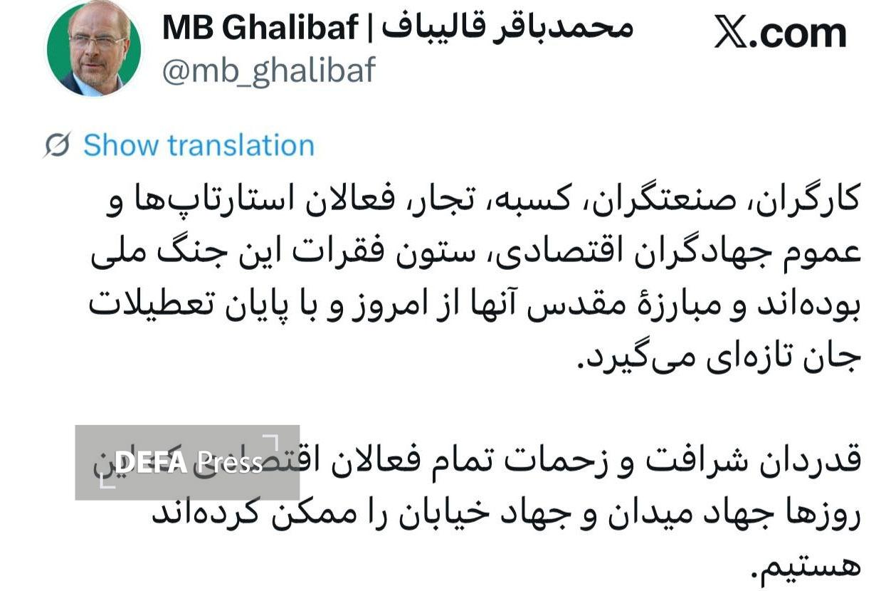 رئیس مجلس نوشت: کارگران، صنعتگران، کسبه، تجار، فعالان استارتاپ‌ها و عموم جهادگران اقتصادی ستون فقرات این جنگ ملی بودند و مبارزه مقدس آنها از امروز و با پایان تعطیلات جان تازه‌ای می‌گیرد.