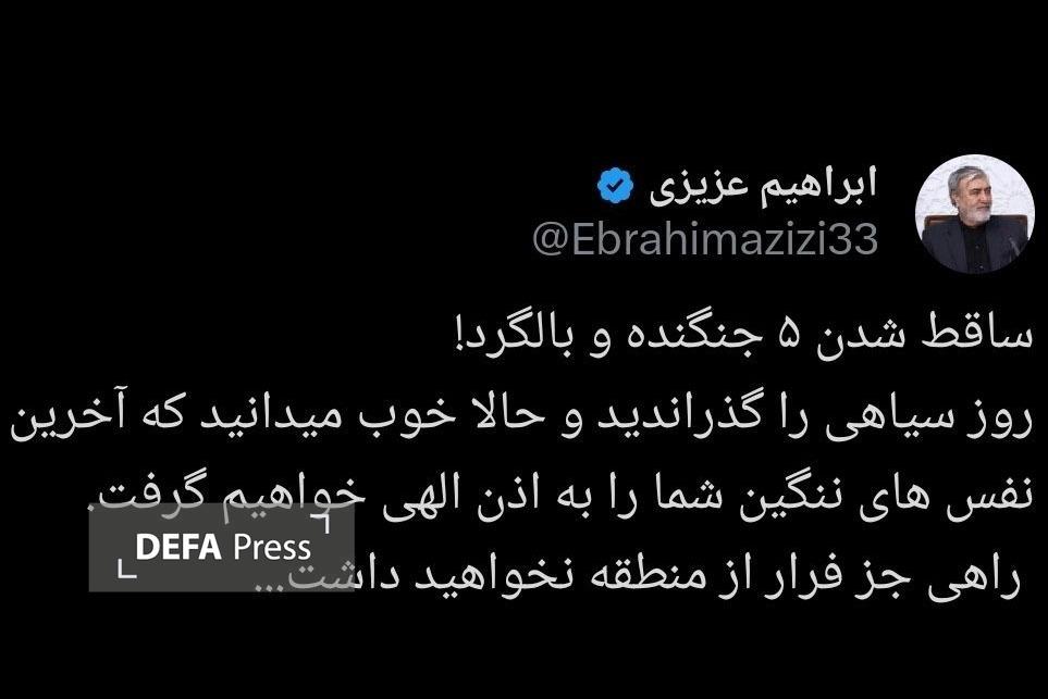 به گزارش گروه سیاسی دفاعپرس، ابراهیم عزیزی رئیس کمیسیون امنیت ملی در صفحه شبکه اجتماعی خود، خطاب به رژیم تروریست آمریکا نوشت: ساقط شدن پنج جنگنده و بالگرد!