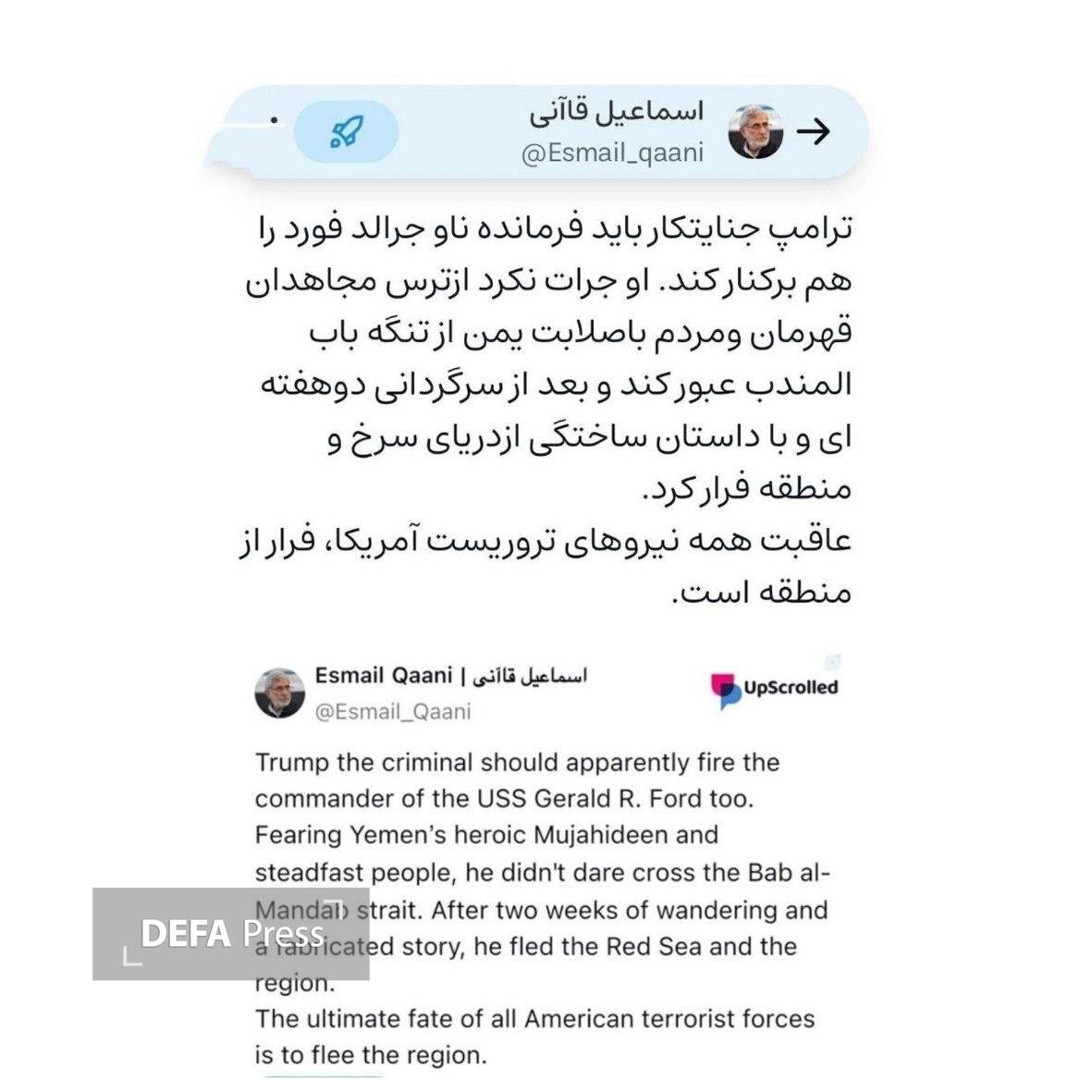 به گزارش گروه دفاعی امنیتی دفاعپرس، سردار «اسماعیل قاآنی» فرمانده نیروی قدس سپاه پاسداران انقلاب اسلامی، نوشت: ترامپ جنایتکار باید فرمانده ناو جرالد فورد را هم برکنار کند. او جرأت نکرد از ترس مجاهدان قهرمان و مردم باصلابت یمن از تنگه بابالمندب عبور کند و بعد از سرگردانی دو هفتهای و با داستان ساختگی از دریای سرخ و منطقه فرار کرد. عاقبت همه نیروهای تروریست آمریکا، فرار از منطقه است.