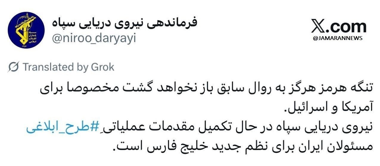 به گزارش گروه دفاعی امنیتی دفاع‌پرس، حساب منتسب به فرماندهی نیروی دریایی سپاه در شبکه ایکس (توییتر) نوشت: تنگه هرمز هرگز به روال سابق بازنخواهد گشت مخصوصا برای آمریکا و اسرائیل.