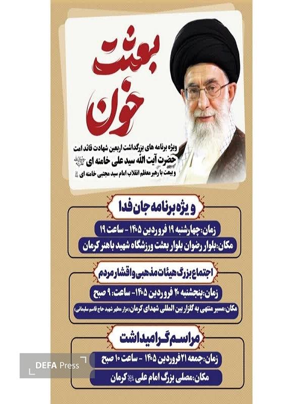 به گزارش دفاعپرس از کرمان، همزمان با ایام اربعین شهادت حضرت آیتالله امام سید علی خامنهای (رضوان الله علیه) و به منظور بیعت با رهبر معظم انقلاب اسلامی، حضرت آیتالله امام سید مجتبی خامنهای (مد ظله العالی)، ویژهبرنامههایی در شهر کرمان برگزار خواهد شد.