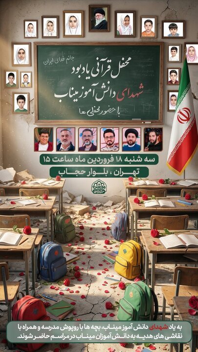 همچنین، در این مراسم و به یاد شهدای مدرسه میناب، بچهها با روپوش مدرسه و نقاشیهای هدیه به دانشآموزان شهید میناب حاضر شوند. علاقهمندان در صورت تمایل برای حضور در این محفل قرآنی میتوانند عدد ۱۶۸ را به شماره ۳۰۰۰۱۱۵۲ ارسال کنند.