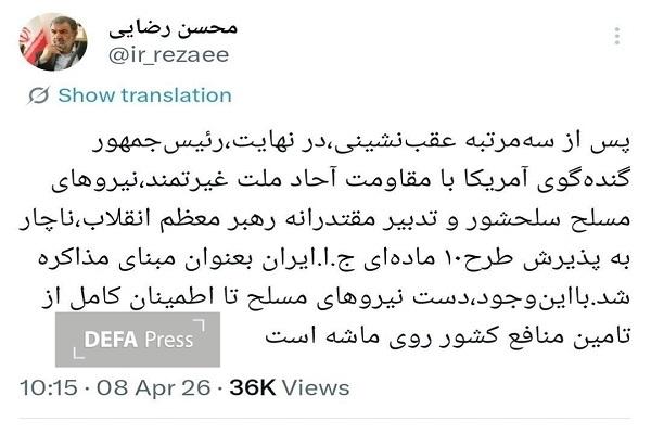 به گزارش خبرنگار دفاعی امنیتی دفاعپرس، سرلشکر «محسن رضایی» فرمانده کل سپاه در دوران دفاع مقدس هشت ساله در ایکس نوشت: پس از سهمرتبه عقبنشینی، در نهایت، رئیسجمهور گندهگوی آمریکا با مقاومت آحاد ملت غیرتمند، نیروهای مسلح سلحشور و تدبیر مقتدرانه رهبر معظم انقلاب، ناچار به پذیرش طرح ۱۰ مادهای ج. ا. ایران بعنوان مبنای مذاکره شد. بااینوجود، دست نیروهای مسلح تا اطمینان کامل از تامین منافع کشور روی ماشه است.
