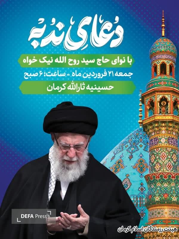 به گزارش دفاعپرس از کرمان، همزمان با فرارسیدن چهلمین روز شهادت حضرت آیتالله خامنهای (قائد امت، رضواناللهعلیه)، مراسم پرفیض دعای ندبه در حسینیه ثارالله کرمان برگزار خواهد شد.