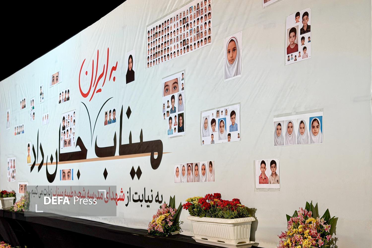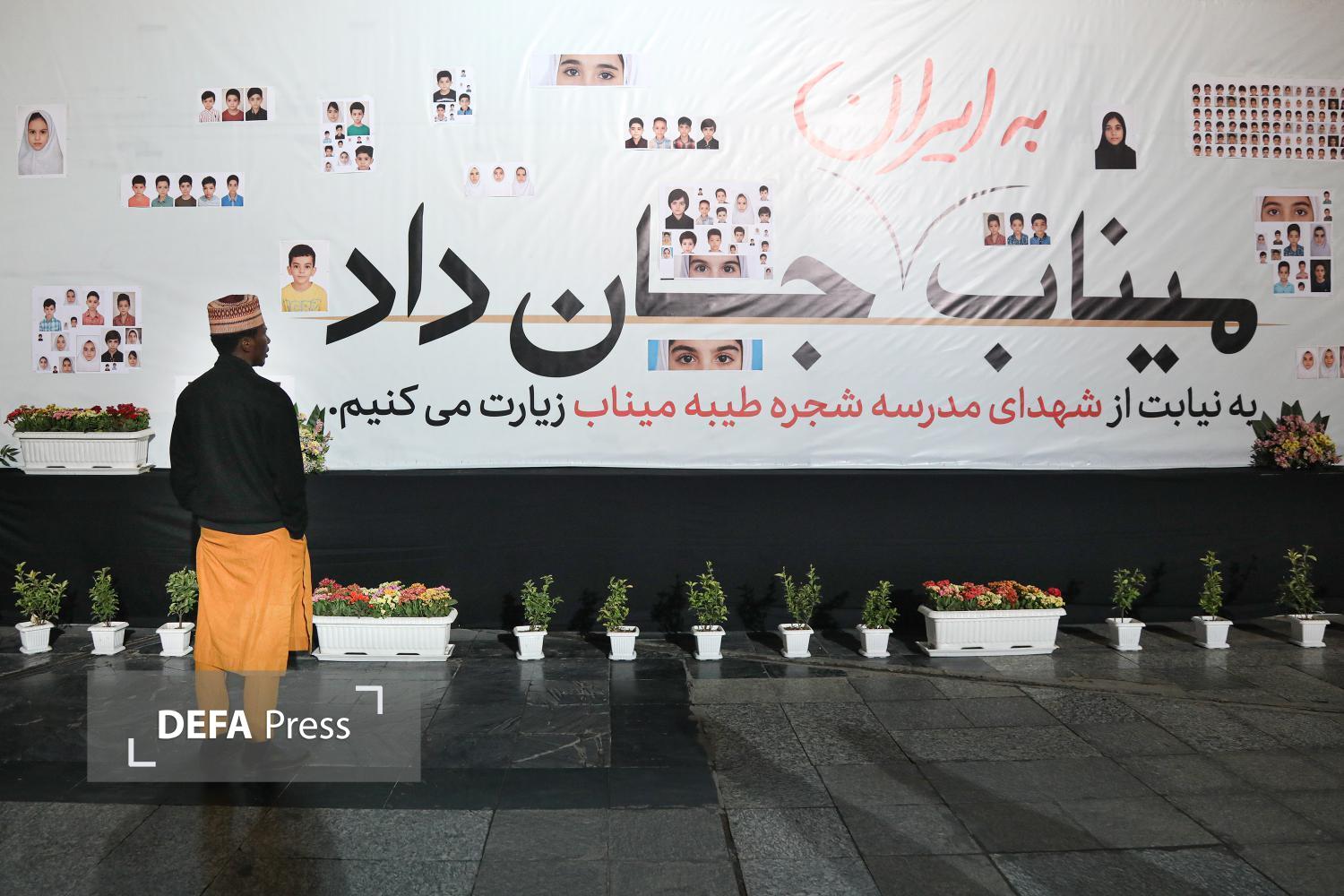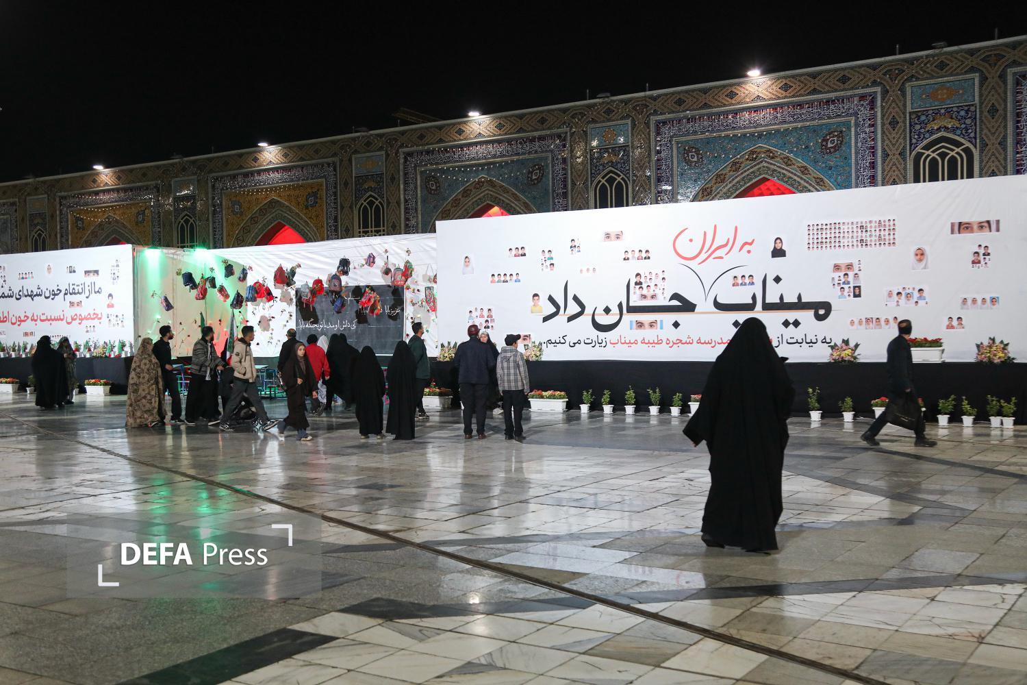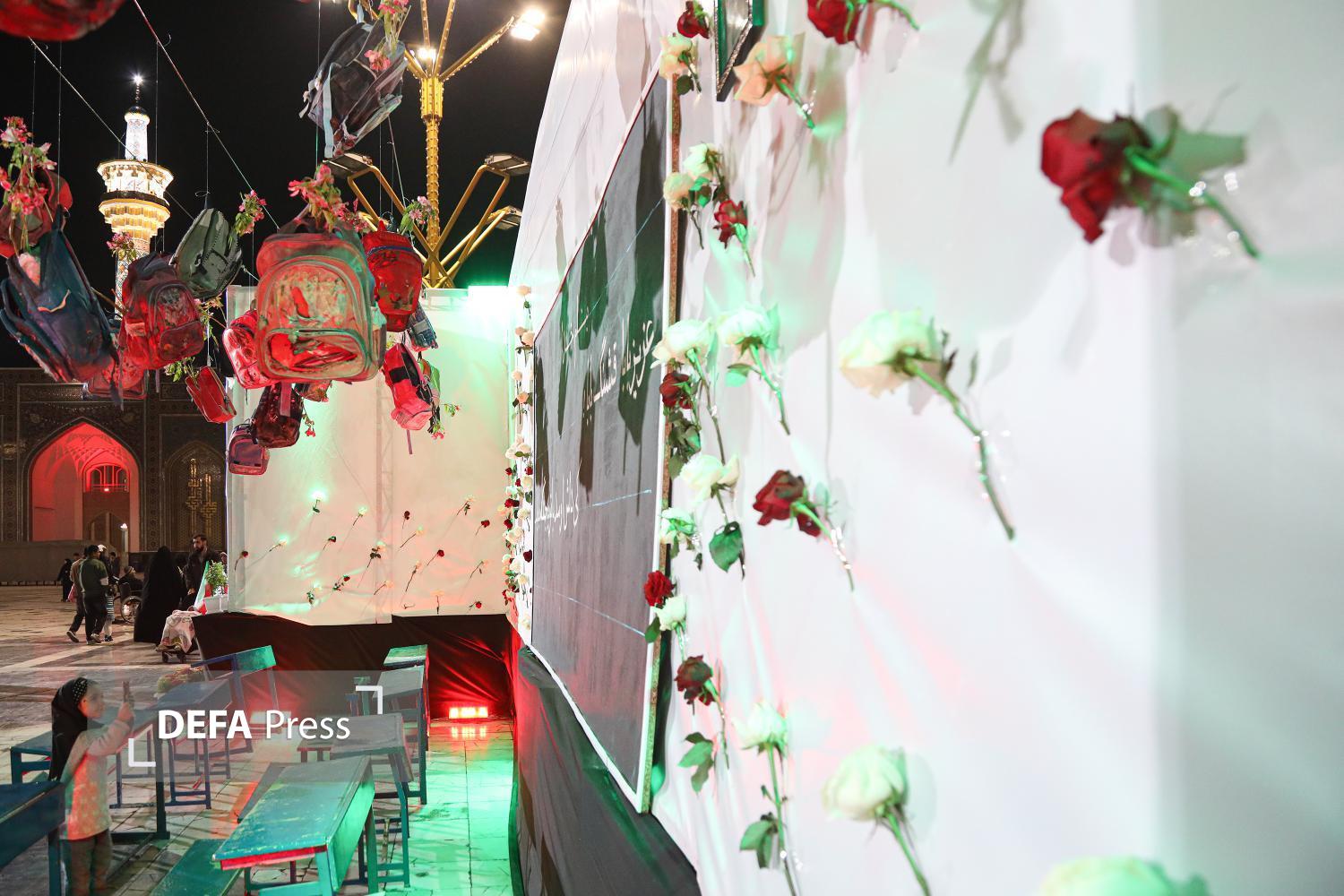 به مناسبت چهلمین روز شهادت دانشآموزان مدرسه شجره طیبه میناب، دیوار نگاره تصاویر شهدای مظلوم این مدرسه و نمادی از کلاس درسشان به همراه جمله تاکید مقام معظم رهبری بر گرفتن انتقام این عزیزان در صحن پیامبر اعظم صلی الله علیه و آله حرم مطهر رضوی به اجرا در آمده است.