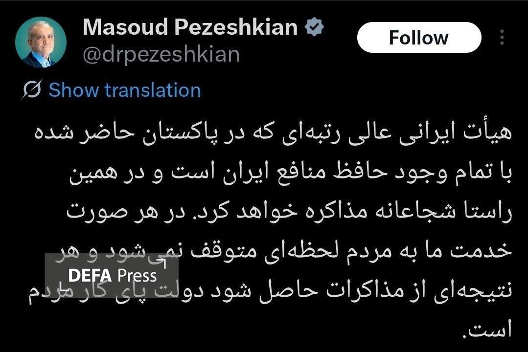 به گزارش گروه سیاسی دفاعپرس، مسعود پزشکیان رئیس جمهور در صفحه اجتماعی ایکس نوشت: هیأت ایرانی عالی رتبهای که در پاکستان حاضر شده با تمام وجود حافظ منافع ایران است و در همین راستا شجاعانه مذاکره خواهد کرد.