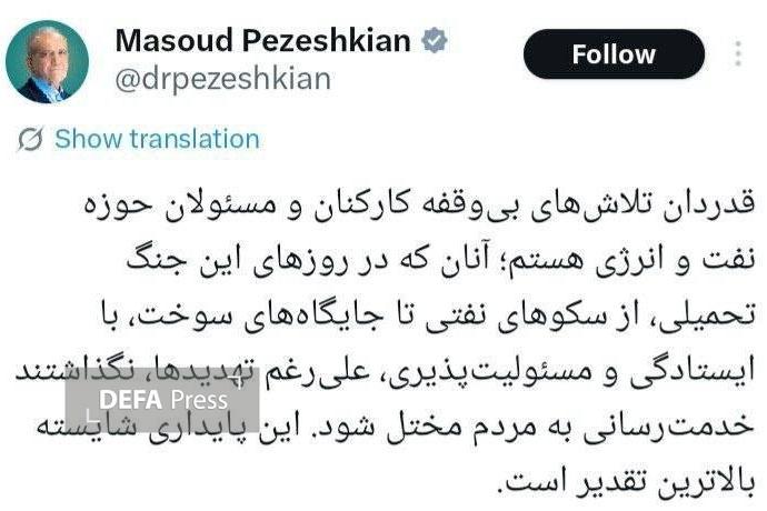 به گزارش گروه سیاسی دفاعپرس، مسعود پزشکیان رئیسجمهور در پیامی در شبکه ایکس نوشت: آنان که در این روزهای جنگ تحمیلی، از سکوهای نفتی تا جایگاههای سوخت، با ایستادگی و مسئولیتپذیری، علیرغم تهدیدها، نگذاشتند خدمت رسانی به مردم مختل شود. این پایداری شایسته بالاترین تقدیر است.