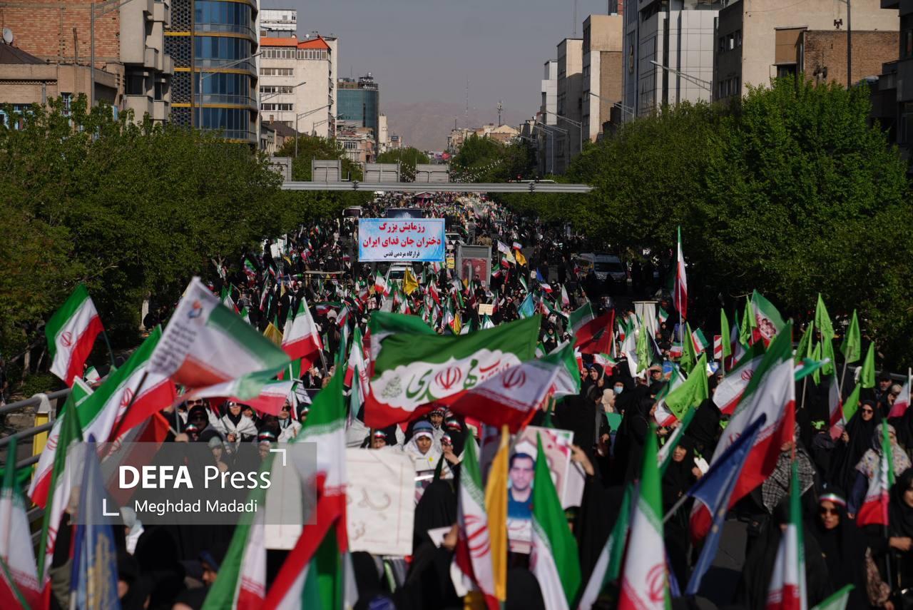 ظاهر راهپیمایی امروز رنگ و بویی متفاوت داشت؛ تلفیقی از نشاط جوانی و صلابت انقلابی؛ پرچمهای سه رنگ ایران در دستان هزاران دختر تهرانی در باد میرقصید و تصاویر رهبر شهید و حضرت آیتالله مجتبی خامنهای، رهبر معظم انقلاب، بر روی سینهها و در دستان شرکتکنندگان خودنمایی میکرد.