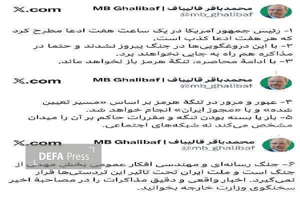 به گزارش گروه سیاسی دفاع‌پرس، «محمدباقر قالیباف» رئیس مجلس در حساب کاربری خود نوشت:با ادامهٔ محاصره، تنگهٔ هرمز باز نخواهد ماند.