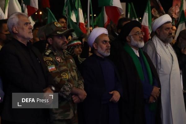 در این مراسم حماسی، شرکتکنندگان با در دست داشتن پرچمهای جمهوری اسلامی ایران و تصاویر رهبر شهید و مقام معظم رهبری، با سردادن شعارهای «ارتش فدای ملت»، «ارتش دوستداشتنی»، «ارتشی دلاور»، «مرگ بر آمریکا» و «مرگ بر اسرائیل»، حمایت قاطع خود را از نیروهای مسلح و آرمانهای انقلاب اسلامی اعلام کردند.