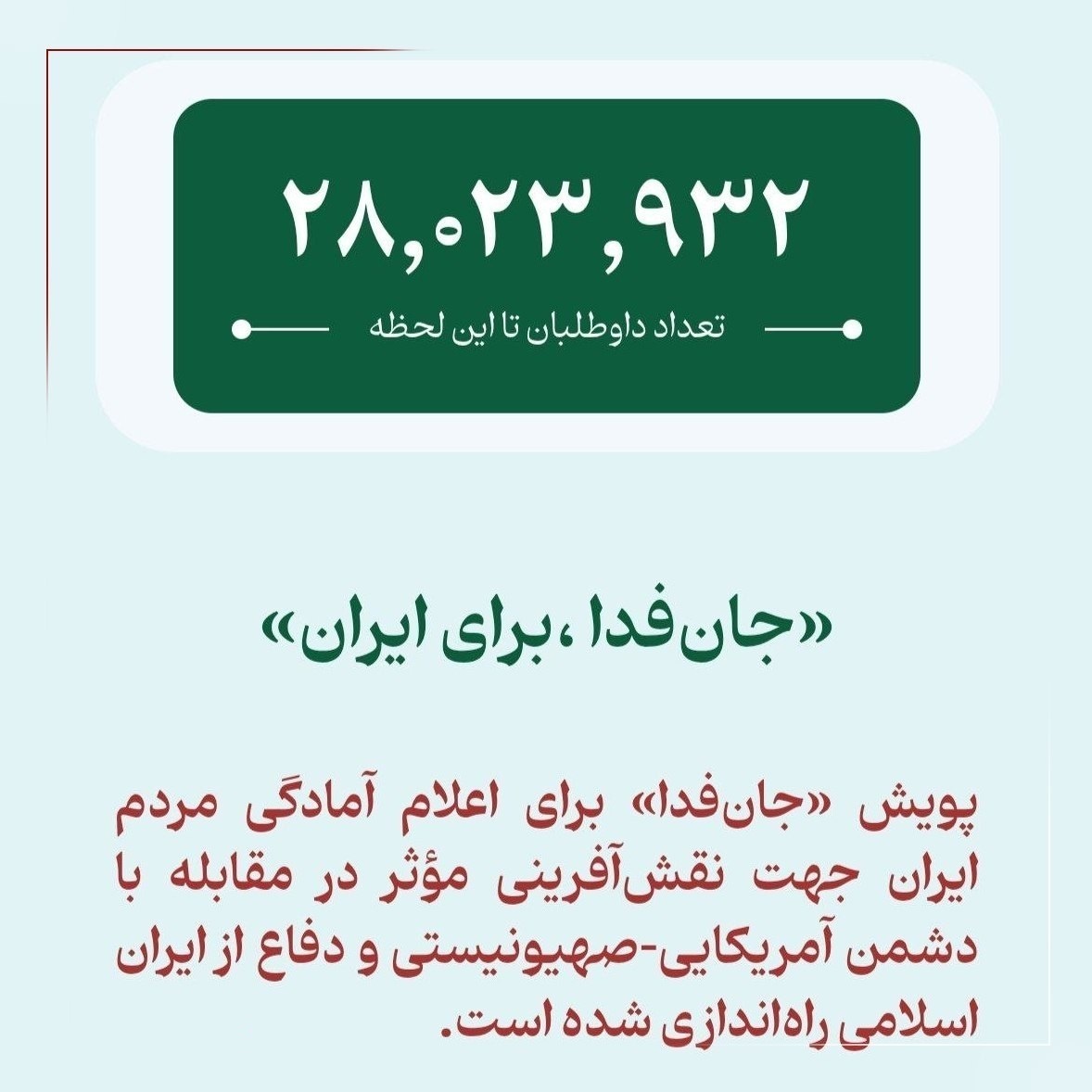 در روزهای اخیر و حتی با اعلام آتشبس روند صعودی خود را با سرعت بیشتری طی و با استقبال پرشور هموطنان همراه است. با اعلام آمادگی بیش از ۲۸ میلیون نفر در پویش «جانفدا برای ایران» جهت دفاع از ایران اسلامی بزرگترین ارتش مردمی دنیا در ایران تشکیل شد. ملت عزیز ایران همچنان میتوانند برای ثبتنام در پویش «جانفدا» با ارسال عدد ۱ به ۳۰۰۰۱۱۵۵ و یا از طریق آدرس janfadaa.ir اقدام کنند.
