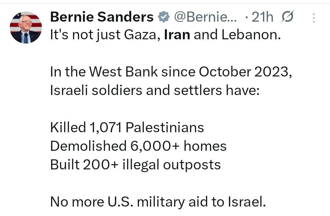 به گزارش گروه بینالملل دفاعپرس، «برنی سندرز» سناتور مستقل آمریکایی با انتشار پیامی در حساب کاربری خود در شبکه ایکس نوشت: فقط غزه، ایران و لبنان نیست.