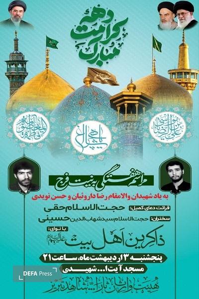 بمناسبت سالروز شهادت شهیدان والامقام حاج رضا داروئیان و حسن نویدی مراسم بزرگداشتی از سوی هیئت وارثان ثارالله شاهد تبریز برگزار خواهد شد.