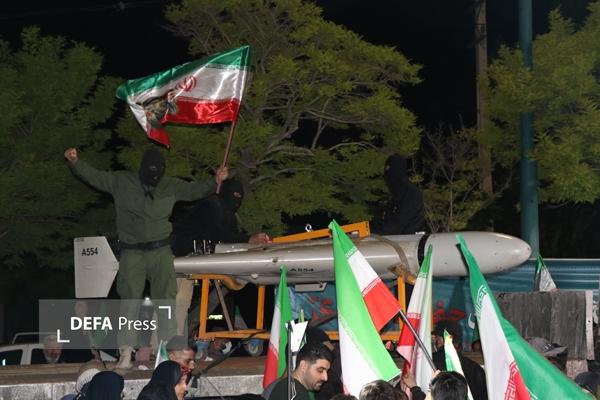 فرزندان آهنین این ملت، پهپادهای شاهد ۱۳۶، آرام و باوقار، بر کامیون قرار داشتند و در میان مردم حرکت میکردند. در یک لحظه، صدای تحسین جمعیت اوج گرفت، دوربینها بالا رفت، اشکها سرازیر شد و بانگ «اللهاکبر» و نیز فریادهای «نیروهای مسلح، تشکر، تشکر» آسمان کرج را پر کرد.