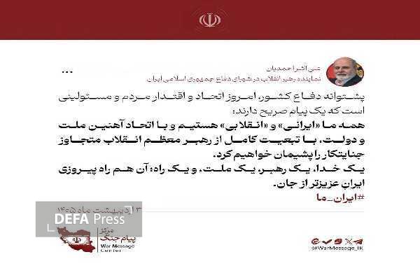 به گزارش گروه دفاعی امنیتی دفاع‌پرس- نماینده رهبری در شورای دفاع پیام مشترک وحدت را منتشر کرد‏؛ احمدیان گفت: پشتوانه دفاع کشور، امروز اتحاد و اقتدار مردم و مسئولینی است که یک پیام صریح دارند؛ همه ما «ایرانی» و «انقلابی» هستیم و با اتحاد آهنین ملت و دولت، با تبعیت کامل از رهبر معظم انقلاب متجاوز جنایتکار را پشیمان خواهیم کرد.