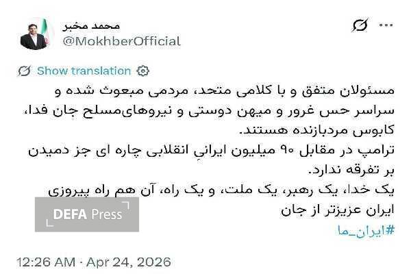 به گزارش گروه سیاسی دفاع‌پرس، محمد مخبر مشاور و دستیار مقام معظم رهبری به پویش هم صدایی مسئولان در مقابل یاوه گویی ترامپ واکنش نشان داد.