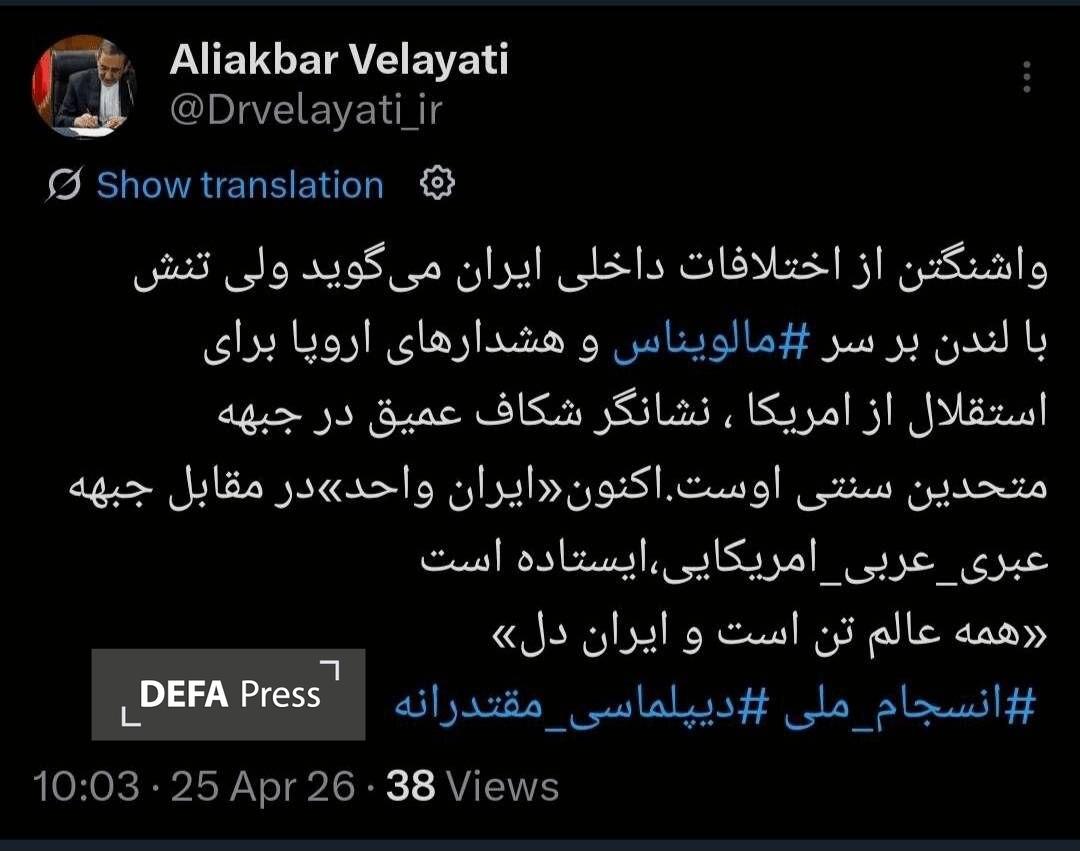 به گزارش گروه سیاسی دفاعپرس، «علیاکبر ولایتی» مشاور رهبر معظم انقلاب اسلامی در پیامی در شبکه اجتماعی ایکس نوشت: واشنگتن از «اختلافات داخلی ایران» میگوید ولی تنش با لندن بر سر مالویناس و هشدارهای اروپا برای استقلال از آمریکا، نشانگر شکاف عمیق در جبهه متحدین سنتی اوست.