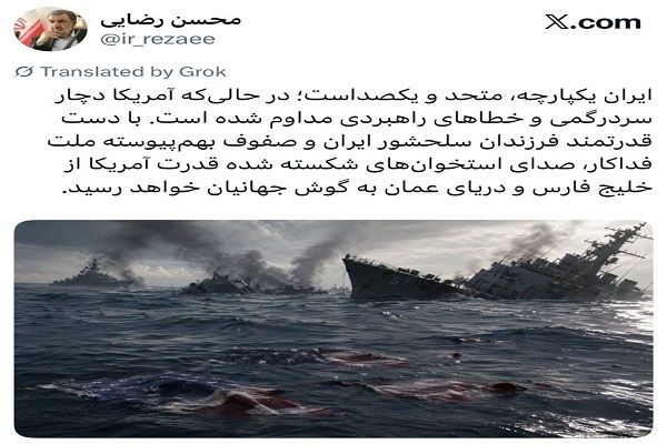 به گزارش گروه دفاعی امنیتی دفاعپرس، سرلشکر «محسن رضایی» فرمانده کل سپاه در دوران دفاع مقدس هشتساله در توئیتی نوشت: ایرانِ یکپارچه، متحد و یکصداست؛ در حالیکه آمریکا دچار سردرگمی و خطاهای راهبردی مداوم شده است. با دست قدرتمند فرزندان سلحشور ایران و صفوف بهمپیوسته ملت فداکار، صدای استخوانهای شکسته شده قدرت آمریکا از خلیج فارس و دریای عمان به گوش جهانیان خواهد رسید.
